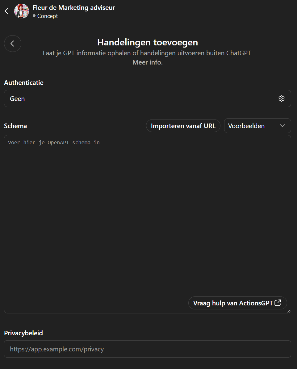 Als je geavanceerder wilt worden, kun je via de button onder aan de Configure pagina βCreate new actionβ of “Nieuwe handeling maken” een API integreren met je chatbot. Hoewel deze les hier niet verder op ingaat, is het een krachtige manier om de functionaliteit van je chatbot uit te breiden.