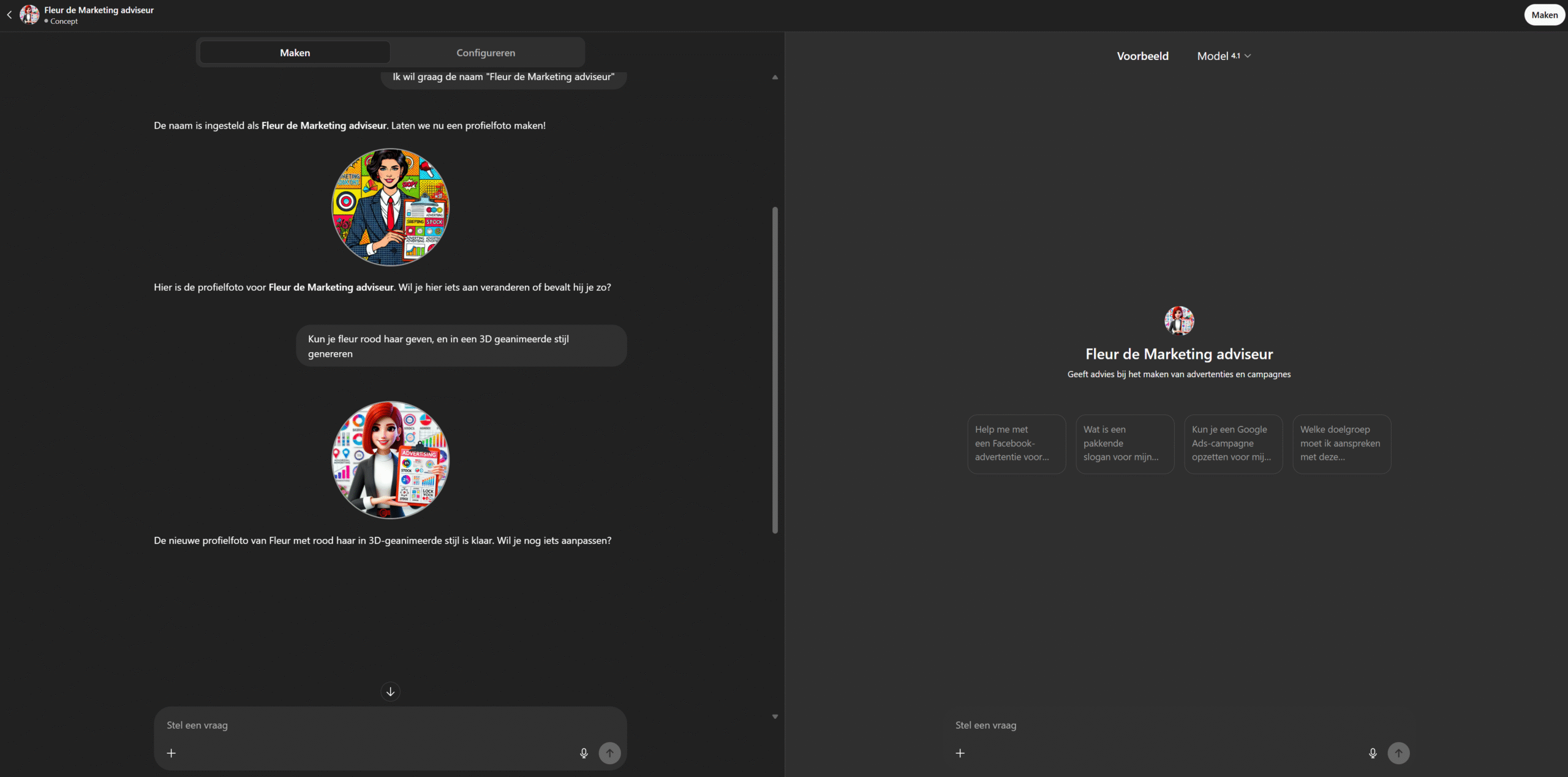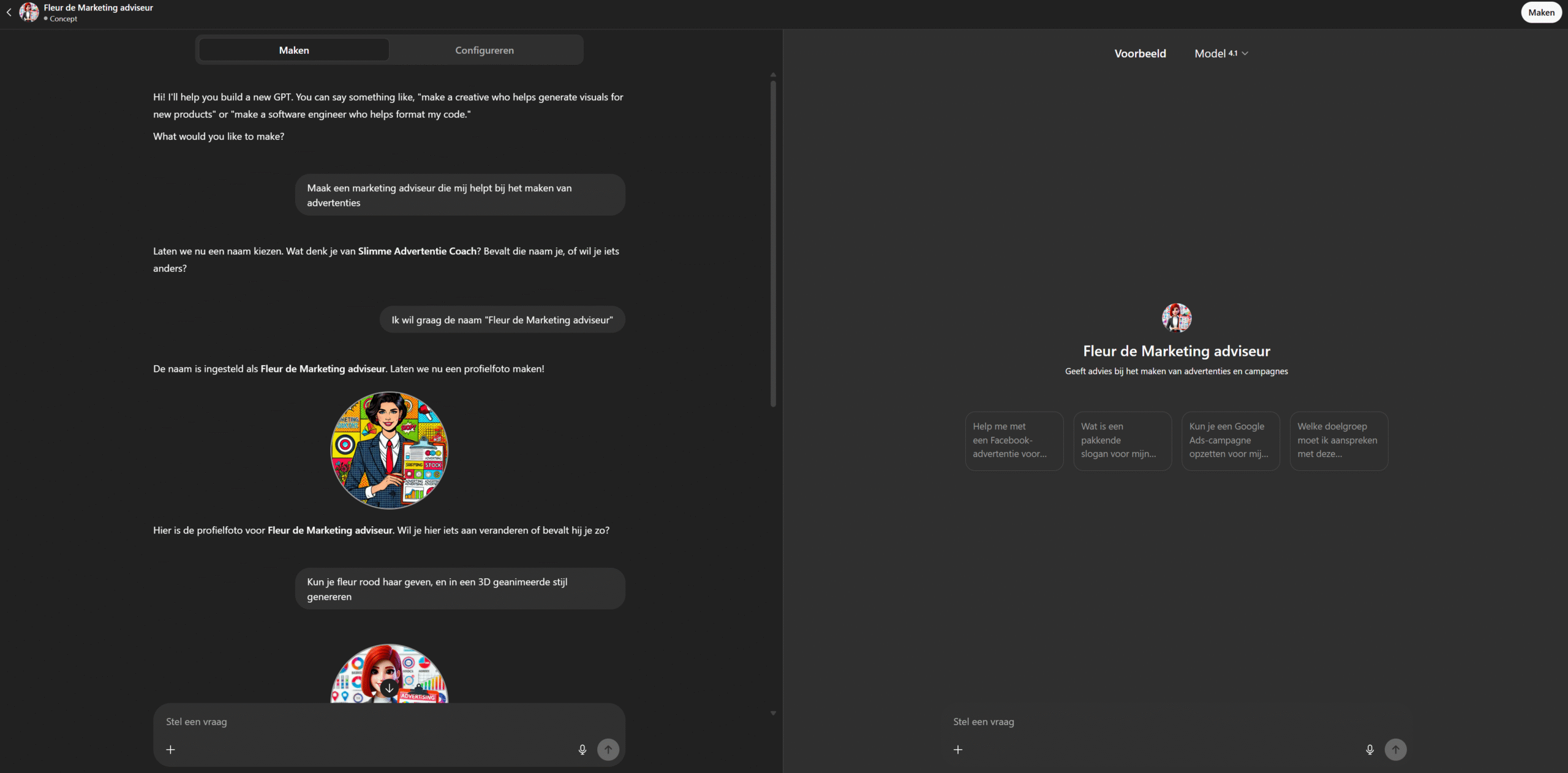 - Aan de rechter kant kun je doormiddel van prompts je Custom GPT creeΓ«ren. Aan de rechter kant van het scherm kun je het voorbeeld zien van jouw bot, en het ook testen.