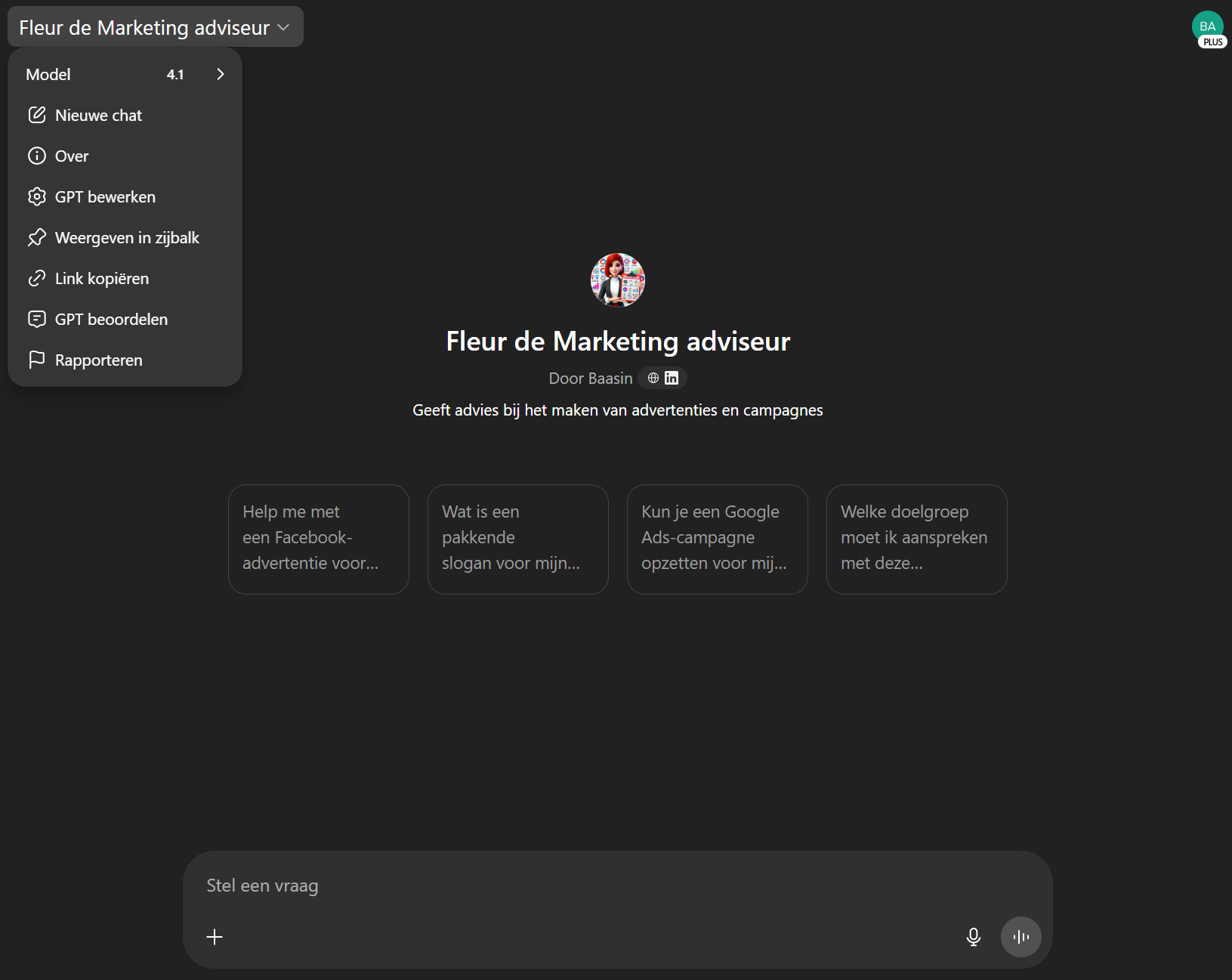 Nadat je op de button βOpslaanβ geklikt hebt, verschijnt het scherm waar je kunt beginnen met het praten met jouw CustomGPT chatbot. Om de bot met anderen te delen, klik je linksboven op de naam van je chatbot. Kies vervolgens ββLink kopiΓ«renβ in het menu. Deze link kun je daarna delen met je netwerk!